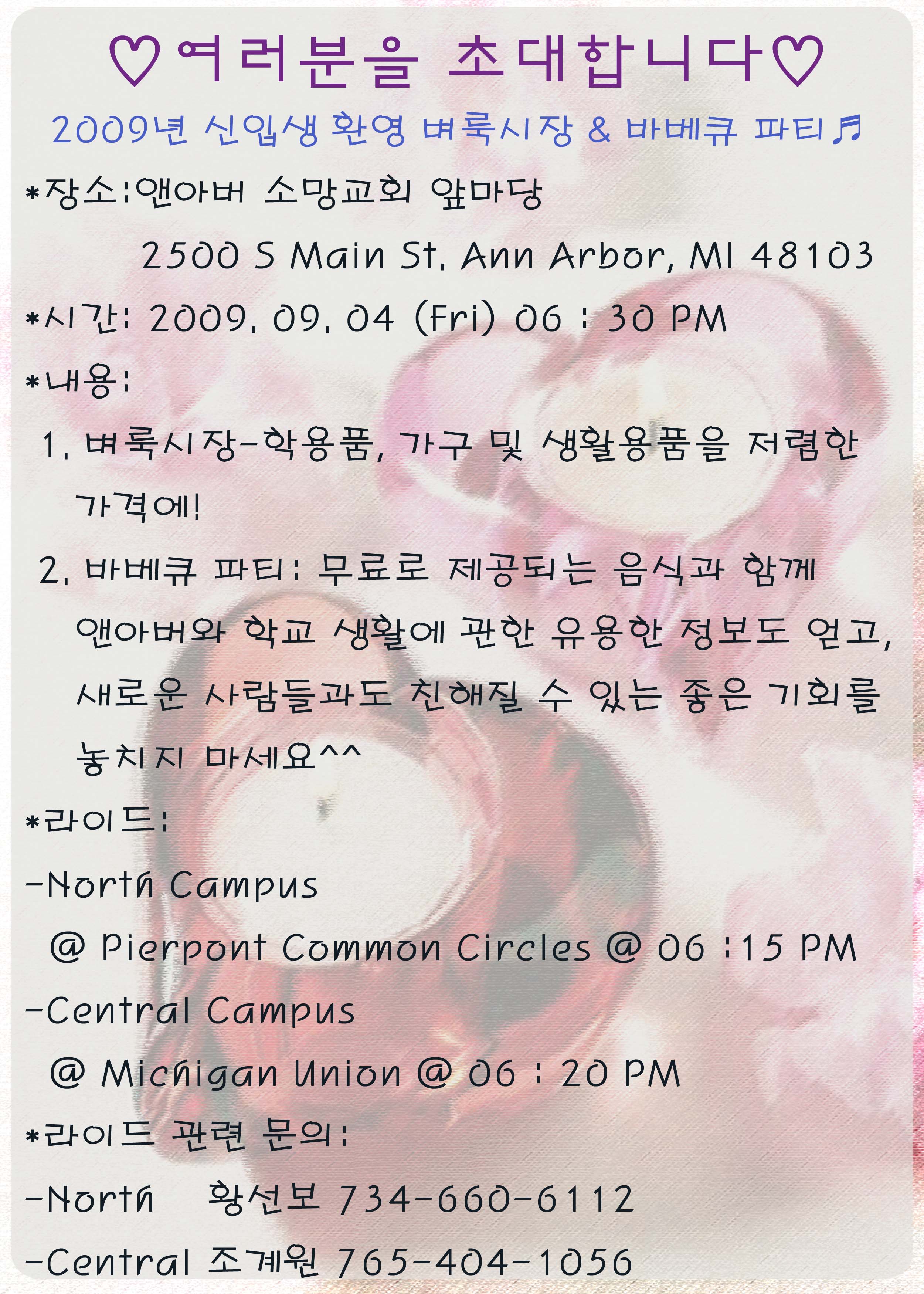라이드 관련 문의: (North) 734-660-6112 (황선보)